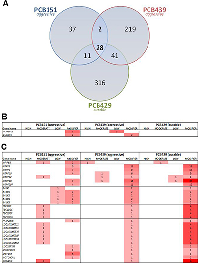 Figure 6: (A) Overlap of mutated gene in three human osteosarcomas. (B) Two genes were mutated in both aggressive tumors but not in the curable tumor. (C) An additional 28 genes were mutated in all human osteosarcoma specimens, including a high-impact mutation in NPIPB3, and clusters in the NBPF, BAGE and TBC1D families.