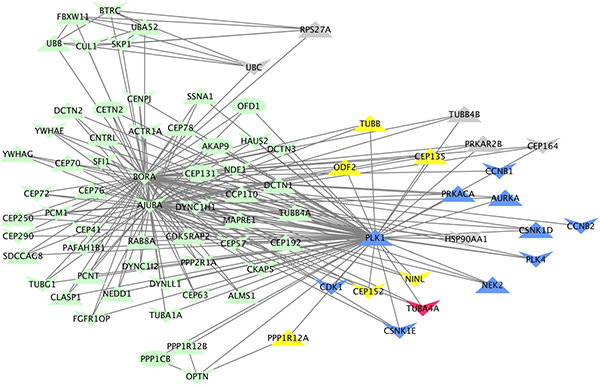 Figure 7: Visual representation of the “Regulation of PLK1 activity at G2/M transition” REACTOME pathway, annotated with genomic, transcriptomic and functional data specific to patient PCB151. Each of the 78 genes in the pathway are represented as nodes and known interactions are depicted by arrows. Node shape indicates the direction of copy number variation (down = deletion, up = amplification). Blue nodes are targets of drugs with in vitro efficacy. Grey nodes are genes with aberrant expression (fold-change greater than 2 but not statistically significant). Yellow nodes are differentially under-expressed genes (p < 0.05). The red node (TUBA4A) contains four moderate-impact mutations.