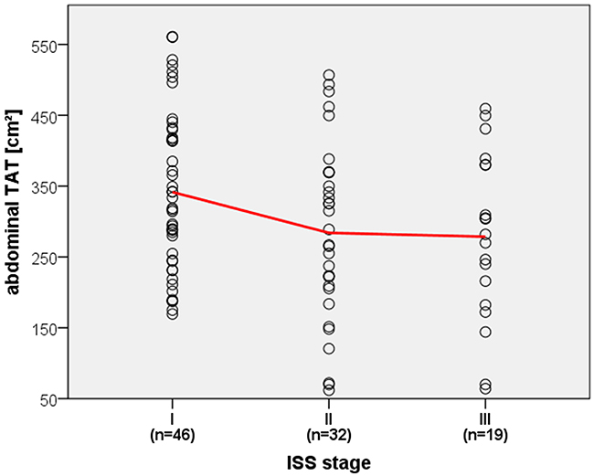 Regarding ISS stages, a reciprocal correlation was found with the abdominal TAT (p=0.048, mean for ISS stage I = 341.55 cm2 and for ISS stage III = 278.6 cm2) and SAT (p=0.036, mean for ISS stage I = 199.46 cm2 and for ISS stage III = 164.8 cm2), visualized in Figure 1.