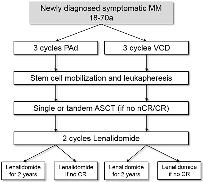 Figure 5: Treatment protocol of the GMMG MM5 study. Flow Chart of the GMMG MM5 study. Patients were randomized to four treatment arms with either PAd (2 arms) or VCD (2 arms) induction therapy and lenalidomide maintenance therapy either for 2 years or until complete response was achieved. PAd: bortezomib-adriamycin-dexamethasone; VCD: bortezomib-cyclophosphamide-dexamethasone; ASCT: autologous stem cell transplantation; CR: complete response; nCR: near complete response.