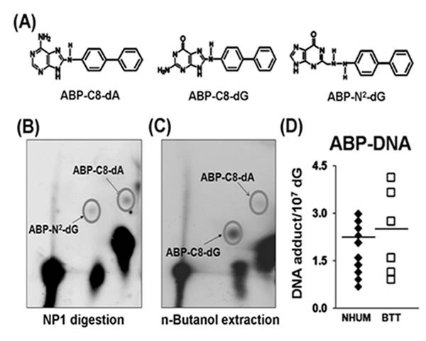 4-ABP-DNA adduct analysis in normal human urothelial mucosa and bladder tumor tissue genomic DNA.