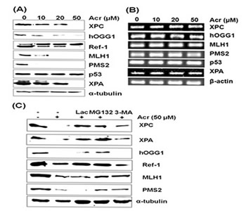 Total RNAs were extracted using the PureLinkTM RNA Mini Kit (Invitrogen). Reverse transcription was performed using the SuperScriptTM III First-Strand Synthesis System (Invitrogen). The levels of repair proteins, XPA, XPC, hOGG1, Ref1, p53, MLH1 and PMS2 were detected by Western blotting as previously described [26].