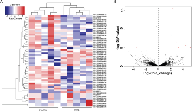 Figure 2: The heat map and volcano plots. (A) Heat maps showing unsupervised clustering of CCA and controls based on differentially expressed up-regulated lncRNAs (red) and long non-coding genes (blue). (B) Volcano plots of all the detected transcripts in both the CCA and biliary obstruction groups. The vertical dotted line delimits up-and down-regulation. Red plots: significant lncRNAs.