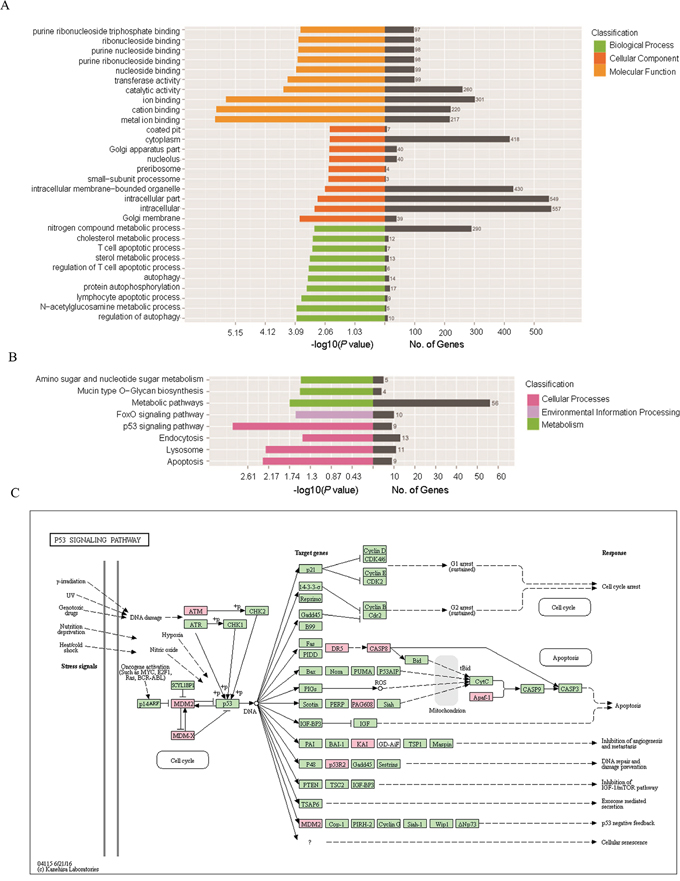 KEGG pathway analysis indicated that 240 pathways were involved in the current sequencing data, in which many pathways were related to cellular processes, environmental information processing, genetic information processing, human diseases as well as organismal systems (Figure 3B). The most enriched top ten pathway terms with the lowest p-value were p53 signaling pathway, apoptosis, lysosome, metabolic pathways, FOXO signaling pathway, mucin type O-Glycan biosynthesis, amino sugar and nucleotide sugar metabolism, endocytosis, sulfur metabolism, tryptophan metabolism. Further details were shown in Table 5. The most significant difference term was “p53 signaling pathway” (KEGG ID: hsa04115, p: 0.001), which involved 9 target genes and the network (Figure 3C).