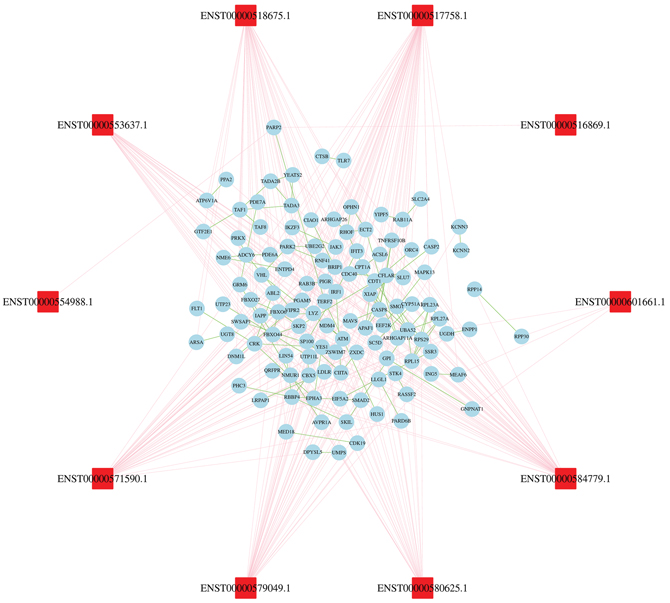 Figure 4: Construction of lncRNAs-proteins co-expression network. The blue oval represented gene, and the red rectangle represented lncRNA. The pink lines link gene to lncRNA, green lines link gene to gene.