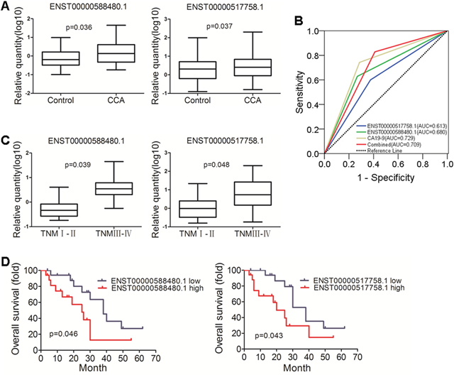Figure 5: Validation of diagnostic and prognosis value of lncRNAs in CCA. (A) Different expression of ENST00000588480.1 and ENST00000517758.1, the two lncRNAs were up-regulated in CCA group (p = 0.036 and 0.037). (B) ROC curve of lncRNAs and CA19-9. The analysis showed the AUC of CA19-9 was 0.729 (95% CI, 0.620 - 0.837, it had a sensitivity and specificity of 74.3% and 71.4%; AUC of ENST00000588480.1 was 0.680 (95% CI, 0.565 - 0.796), it had a sensitivity and specificity of 62.9% and 73.2%; When ENST00000588480.1 and ENST00000517758.1 were combined, They got greater sensitivity (82.9%) (AUC: 0.709; 95% CI, 0.601-0.817). (C) The levels of ENST00000588480.1 and ENST00000517758.1 showed a significant increacing trend with the advancement of cancer TNM stages. (p = 0.039 and 0.048). (D) Kaplan-Meier survival overall survival (OS) curves for ENST00000588480.1 and ENST00000517758.1, The ENST00000588480.1 demonstrated statistically significant median overall survival differences (38 vs 25 months, p = 0.046) compared to ENST00000517758.1 (38 vs 20 months, p = 0.043).