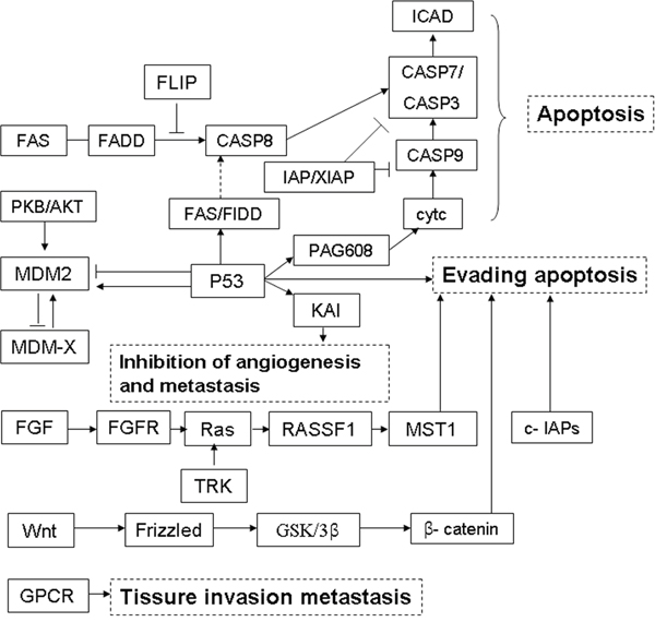 Figure 6: LncRNA signature-associated signalling pathways. A schematic diagram showed the major biological functions closely associated to were apoptosis, angiogenesis, invasion and metastasis etc.