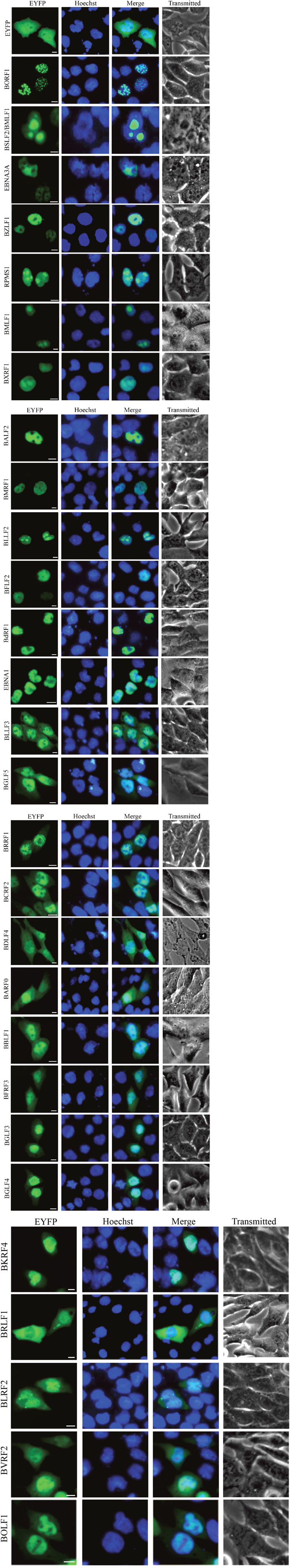 Figure 1: Nuclear localization summary of EBV-encoded proteins. 28 EYFP-fused EBV proteins were expressed in COS-7 cells, and cells were subjected to fluorescence microscope analysis in live cells 24 h after transfection. As a negative control, cells were transfected with the vector control (pEYFP-C1). Pictures were obtained using a Zeiss Axiovert 200M microscope. The same magnification was used in all panels. Representative fluorescence images of the vast majority live cells expressing indicated fusion protein were shown. Cells were counterstained with Hoechst to visualize the nuclear DNA. All scale bars indicate 10 μm.