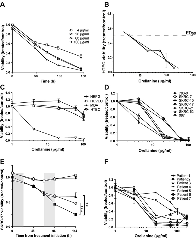 Figure 1: Orellanine is selectively toxic to human tubular epithelial cells and clear cell renal carcinoma cells. (A) Viability of HTEC treated for 24 hours with orellanine, normalized to vehicle treated control (n = 6, mean ± SEM). (B) HTEC were exposed to different concentrations of orellanine for 24 hours and their viability was estimated using Alamar Blue technique at 72 hours, n = 6 for each data point. ED50 equals 4.1 ± 1.2 μg/ml. (C) Viability of HTEC, liver cells (HEPG2), breast cancer cells (MDA-MB-231) and HUVEC at 144 hours post 24 hour orellanine treatment (n = 6, mean ± SEM). (D) Viability of orellanine-treated ccRCC cell lines at 144 h, normalized to vehicle-treated controls (n = 6). One of the the two cell lines showing lowest sensitivity in vitro (SKRC-17 ) was chosen for the in vivo experiments. (E) The SKRC-17 cells were exposed to different concentrations of orellanine for 24 hours. The graphs represent repeated incubation at the doses (◆ 4 and ○20 μg/ml), single treatment (□ 4 and ▲ 20 μg/ml) and doubling of the incubation time from 24 to 48 hours (■ 20 μg/ml), respectively. (F) Orellanine treatment of primary renal cancer cells obtained from 7 patients with clear cell RCC. Data are presented as mean ± SEM and p-values are determined by one way ANOVA with Tukey’s post hoc test, where p < 0.05 was considered significant, **p < 0.01 ***, p < 0.001.