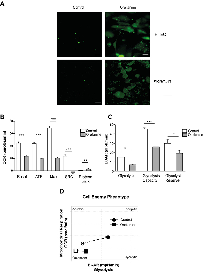 Figure 2: Orellanine induces oxidative stress and down-regulates cell metabolism. (A) Oxidative stress in HTEC and SKRC-17 cells after 24 hours of vehicle or orellanine treatment, using carboxy-H2DCFDA for detection of ROS; scale bar 20 μm. Seahorse experiment showing: (B) Diagram of Basal Oxygen consumption rate (OCR) (basal), ATP production (ATP), maximum OCR (Max), spare respiratory capacity (SRC) and proton leak calculated from the OCR curve. (C) Glycolysis, glycolysis capacity and glycolysis reserve calculated from the Extracellular acidification rate (ECAR) curve. (D) Diagram showing the cell energy phenotype shift during mitochondrial stress conditions.