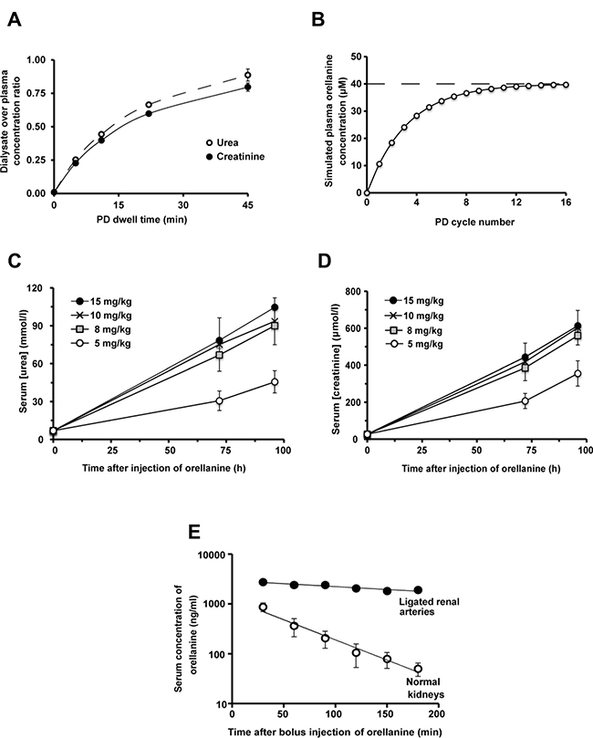 To be able to study the effect of orellanine on ccRCC tumors we developed I) a chronic rat peritoneal dialysis (PD) model and II) a human ccRCC xenograft athymic nude rat model. These were combined in order to analyze the anti-tumor effect of orellanine. The efficiency of the dialysis in the rat model was demonstrated by the dialysate to plasma concentration ratio (D/P). After a dwell time of 45 minutes the D/P for urea was 0.89 ± 0.05 while the D/P for creatinine was 0.80 ± 0.03. The efficiency of the PD was shown by dialysate urea and creatinine concentrations approaching those in plasma within 30 minutes (Figure 4A). In subsequent in vivo experiments, orellanine was added to the PD fluid in order to maintain a stable plasma concentration. As seen in Figure 4B, a steady-state serum concentration of orellanine was obtained within the first day. Orellanine administration resulted in renal failure as shown by a rapid rise in serum urea (Figure 4C) and creatinine (Figure 4D), with polyuria at day 2–3 that progressed into anuria at day 4–5 (male Sprague-Dawley rats). We also studied the elimination of orellanine after a bolus injection in anesthetized tumor-bearing RNU rats. The halflife was 37 ± 3 min in intact animals, and 259 ± 71 min in rats with ligated renal arteries indicating the kidney as main elimination route (Figure 4E).