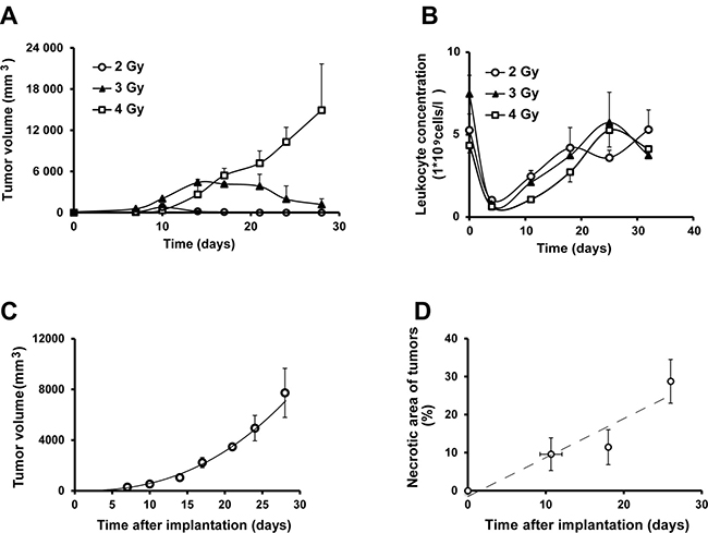 To establish a renal cancer model in rat we defined a radiation dose to suppress the B cell-mediated immune response against the xenografted tumor cells. A pre-implantation irradiation dose of 4 Gray provided a sustained growth of xenografted human renal cancer cells (SKRC-17, Figure 5A). Four days post-irradiation, when blood leukocyte count was lowest (Figure 5B), 107 SKRC-17 tumor cells were implanted subcutaneously in the shoulder region. Tumor growth was measured weekly and the volume was calculated: (h*w*d*π/3), Figure 5C. The tumors showed 10% necrotic areas during the first two weeks, but as tumor volume increased, histologically determined necrosis in central parts of the tumors approached 30% (Figure 5D).