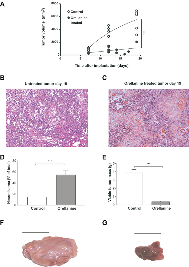 Figure 6: Orellanine significantly reduces tumor growth and induces necrosis. Tumor volume in control rats and in rats receiving orellanine treatment, 10 mg/L for 48 hours via the dialysis solution at Day 8–9 (controls n = 5, treated n = 6). (B–C) Representative photos of hematoxylin and eosin stained tumor sections of control rats (B) and orellanine-treated rats (C), analyzed at day 16 post inoculation. (D) Necrotic area (%) of total tumor area and (E) viable tumor mass after subtraction of necrotic areas (controls n = 5, treated n = 6). (F) Representative photo of (F) control tumor and (G) orellanine-treated tumor. Data in a, d–e are presented as mean ± SEM and p-values are determined by t test, where p < 0.05 was considered significant. ***p < 0.001.