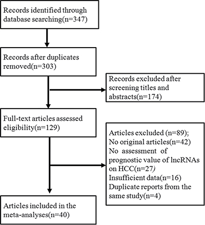 Through a search of the PubMed and EMBASE databases, a total of 347 primary studies were obtained. After eliminating 307 papers that did not meet the selection criteria in the next screening, a final total of 40 articles were included in the study. The original data were extracted from these 40 papers for meta-analysis [9, 11, 12, 15, 25–40] and other airticles [10, 13, 14, 16, 41–56]. The flow chart of the literature screening is shown in Figure 1. Forty included articles were published between 2011 and 2016, and all of them were retrospective studies reporting the expression of 71 lncRNAs in HCC patients. The average sample size in these papers was 120. In most studies, lncRNAs were detected in the patient’s plasma. All lncRNAs were measured using quantitative real-time polymerase chain reaction (PCR), with glyceraldehyde 3-phosphate dehydrogenase (GAPDH) or β-actin as the reference gene. Five independent reviewers assessed the 40 included articles according to the method mentioned above, with the quality remaining moderate. Supplementary Table 1 provides more information on the assessment. Twenty-nine of the included articles directly reported the relationship between high-level lncRNAs and the survival rate, while 11 studies reported the relationship between low-level lncRNAs and the survival rate. Their HR value and 95% CIs are shown in Supplementary Table 2 and Figure 2 shows that an HR > 1 implied worse survival for the group with elevated lncRNA expression. Conversely, an HR < 1 represented worse survival for the group with decreased lncRNA expression.