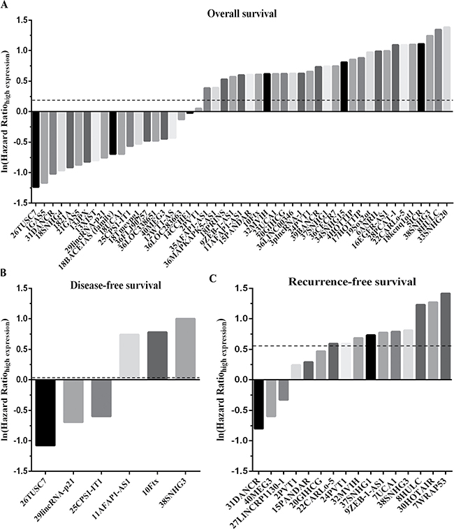 Figure 2: The histogram for hazard ratio (HR) and 95% confidence interval (95%CI) values of each lncRNA affected the survival rate of HCC. (A) Overall survival (OS). (B) Disease-free survival (DFS). (C) Recurrence-free survival (RFS). (Take the 26TUSC7 for example, it contains two parts. The number of 26 represents the serial number among the 40 stuies, and the TUSC7 stand for the lncRNAs’ name).