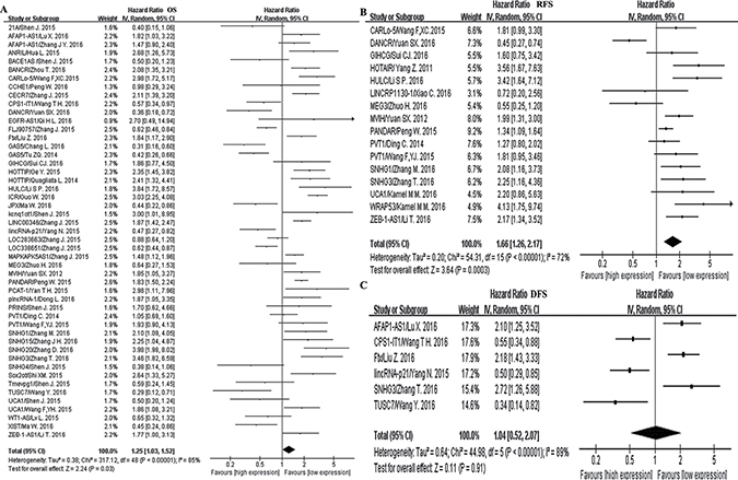 Figure 3: Forest plots of the studies to assess the pooled hazard ratio (HR) and 95% confidence interval (95%CI) values of lncRNAs. (A) Overall survival (OS). (B) Disease-free survival (DFS). (C) Recurrence-free survival (RFS).