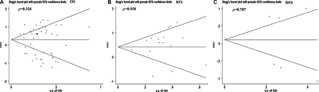 Figure 5: Use of Begg’s funnel plot to evaluate publication bias of the included studies. There was no significant publication bias for all the included studies. (A) Overall survival (OS). (B) Disease-free survival (DFS). (C) Recurrence-free survival (RFS).