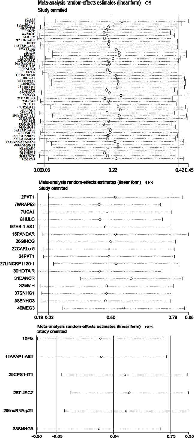 In this meta-analysis, we found that inconsistent expression level of overall lncRNAs in the blood has a positive statistical significance. The results of the meta-analysis indicated that lncRNA expression levels are a promising biomarker to predict survival in patients with HCC. Compared with patients with low expression levels of lncRNAs, patients with increased expression levels of lncRNAs had a 1.25-fold higher risk of poor OS, a 1.66-fold higher risk of RFS, and an insignificant risk of DFS. Heterogeneity is an important reference factor for meta-analysis. Forest plots and I2 showed the existence of heterogeneity. Hence, sensitivity analysis and meta-regression analysis were used to determine the possible causes of heterogeneity. Meta-regression analysis revealed p values greater than 0.05 for all specified covariates, indicating that the heterogeneity of the sources of uncertainty had been identified. Additionally, different cutoff values among the included studies may also be a potential source of heterogeneity. More well-designed studies with large sample sizes are needed to clarify this issue and further explore the relevant mechanisms.