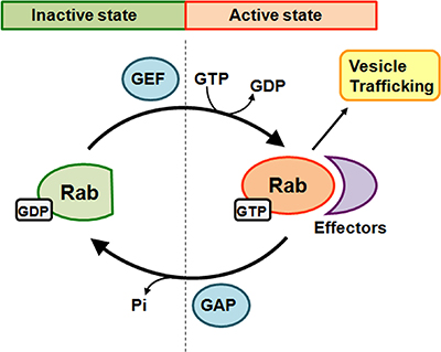 The Rab proteins cycle between two states, the GTP-bound active state and the GDP-bound inactive state (Figure 1). The inactive Rab proteins located in the cytosol and are recognized by guanine nucleotide exchange factor (GEF), which catalyzes the exchange of GDP for GTP at the guanine nucleotide binding motif to form the active Rab proteins [33]. After coordinating the transport of vesicles to their destination, the active Rab proteins are converted back to the GDP-bound inactive form through hydrolysis of GTP, which is stimulated by a GTPase-activating protein (GAP) [34].
