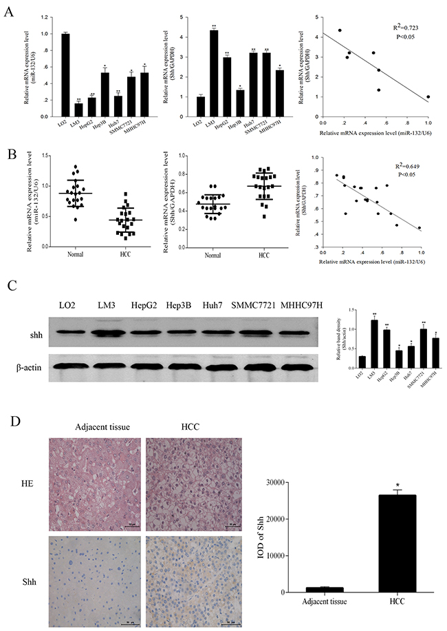 Figure 1: The expression of miR-132 and Shh in HCC cells and tissues. (A, B) The relative mRNA expression of miR-132 and Shh in HCC cells and tissues was detected by qRT-PCR. Statistical analysis of the correlations between the expression of miR-132 and Shh was performed using Spearman correlation analysis in SPSS 20.0 software (R2 = 0.723 for cells and R2 = 0.649 for tissues). (C) The protein expression of Shh was measured by western blotting. β-actin was used as an internal control (n = 3, *P < 0.05 and **P < 0.01 for HCC cells vs. LO2). (D) Hematoxylin-eosin staining of HCC samples and adjacent tissues and immunoreactivity to Shh as observed by fluorescence microscopy (magnification ×400). Integrated optical density (IOD) was analyzed using Image-Pro Plus 6.0 (n = 6, **P < 0.05 for HCC vs. adjacent tissues).