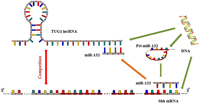 Figure 7: Mechanism of TUG1 and miR-132 action. LncRNA TUG1 competes with miR-132 for binding to the 3′-UTR of Shh, leading to the negative inhibition of miR-132 and the activation of Hh signaling. TUG1 c acts as a “molecular sponge” and binds to miRNA response elements in miR-132, thereby inhibiting miR-132.