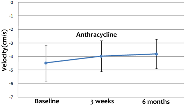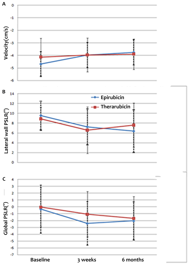 When we compared parameters of cardiac function between the patients who received epirubicin-based and therarubicin-based chemotherapy, we found that after epirubicin-based chemotherapy, the peak early-diastole LV wall velocity and lateral wall and global PSLR differed significantly among the three time points. However, no differences between the time points were observed in patients who received therarubicin-based chemotherapy. The absolute values of peak early-diastole LV wall velocity and the lateral wall PSLR at baseline were higher than those at 3 weeks and 6 months after the final cycle of chemotherapy, whereas the absolute value of global PSLR at baseline was lower than those at 3 weeks and 6 months after the final cycle of chemotherapy, in both the epirubicin-based and therarubicin-based chemotherapy groups. From this, we found that the cardiotoxicity of epirubicin-based chemotherapy may be stronger than that of therarubicin-based chemotherapy.