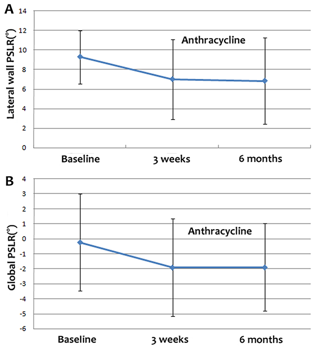 The AUC values for PSLR at 3 weeks and 6 months after the final cycle of chemotherapy in breast cancer patients were 0.649 and 0.665, respectively. The sensitivity and specificity values for a PSLR cut-off value of -2.58° at 3 weeks after the final cycle of chemotherapy were 55.8% and 72.1%, respectively, and those for a PSLR cut-off value of -1.50° at 6 months after the final cycle of chemotherapy were 67.4% and 60.5%, respectively. From these results, we found that use of the global PSLR to detect cardiotoxicity after anthracycline-based chemotherapy was reliable.