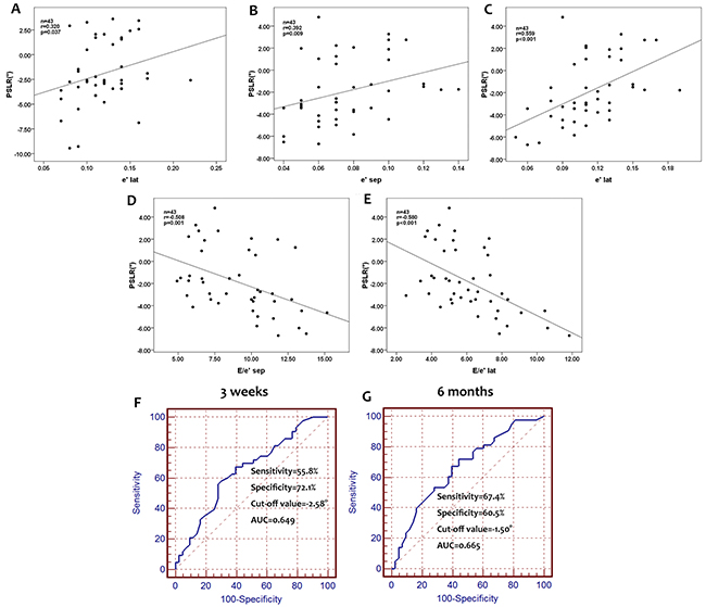 In the present study, no correlations were found between the baseline values of global PSLR and LVEF, E, A, E/A, e’sep, a’sep, e’lat, a’lat, E/e’sep, E/e’lat and cumulative dose of anthracycline. At 3 weeks after the final cycle of chemotherapy, breast patients with a higher e’lat were more likely to have a higher global PSLR. At 6 months after the final cycle of chemotherapy, breast patients with higher e’sep and e’lat and lower E/e’sep and E/e’lat values were more likely to have a higher global PSLR. These findings indicated that although the LV filling pressure did not differ among the three time points, a lower LV filling pressure may correspond to a higher global PSLR.