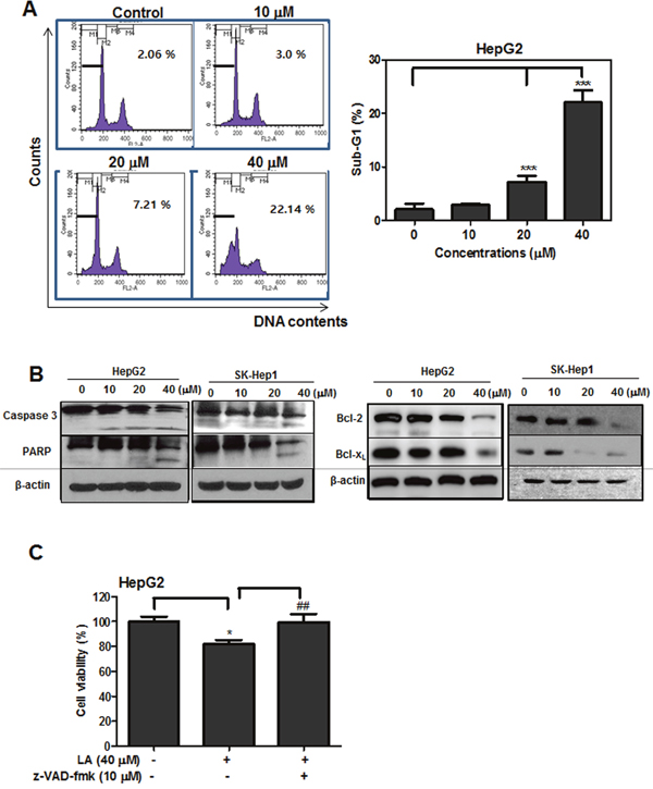 Figure 2: Effect of LA on sub-G1 population and apoptosis related proteins in hepatocellular carcinoma cells. (A) Effect of LA on sub-G1 population in HepG2 cells. HepG2 cells were exposed to LA (10, 20, 40 μM) for 24 h. After fixing in 75% ethanol, the cells were stained with propidium iodide and the cell cycle was analyzed by flow cytometry. Bar graphs showed quantification of sub-G1 cell population (%). Data represent means ± SD. **, p<0.01 versus untreated control. (B) Effect of LA on sub-G1 population and apoptosis related proteins in HCCs.HepG2 and SK-Hep1 cells were treated with various concentrations of LA for 24 h and subjected to Western blotting for caspase-3, PARP, Bcl-2, Bcl-xL and β-actin. (C) Effect of pancaspase inhbibtor Z-VAD-fmk on the viability of LA treated HepG2 cells. HepG2 cells were treated with 40 μM of LA with or without Z-VAD-fmk (10 μM). The cell viability was measured by MTT. Data represent means ± SD. *, p<0.05 and ***, p<0.001 versus untreated control. ##, p<0.01 versus LA (40 μM) treated group (n=3, one-way ANOVA, Tukey's test).