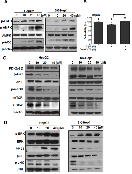 Figure 3: Effect of LA on AMPK and its related proteins in HCC cells. (A) HepG2 and SK-Hep1 cells were treated with indicated concentrations of LA for 24 h and the cells were subjected to Western blotting for p-LKB1, p-AMPK, AMPK, p-ACC, COX-2 and β-actin. (B) HepG2 cells were treated with 40 μM of LA with or without 7.5 μM of compound C for 24 h and MTT assay was conducted. Data represent means ± SD. *, p<0.05 versus untreated control. ##, p<0.01 versus LA (40 μM) only treated group (n=3, one-way ANOVA, Tukey's test). (C) HepG2 and SK-Hep1 cells were treated with various concentrations of LA and Western blotting was conducted with antibodies of PI3K, p-AKT, AKT, p-mTOR, mTOR, COX-2 and β-actin. (D) HepG2 and SK-Hep1 cells were treated with various concentrations of LA and Western blotting was performed with antibodies of p-ERK, ERK, p-p38, p38, p-JNK and JNK.