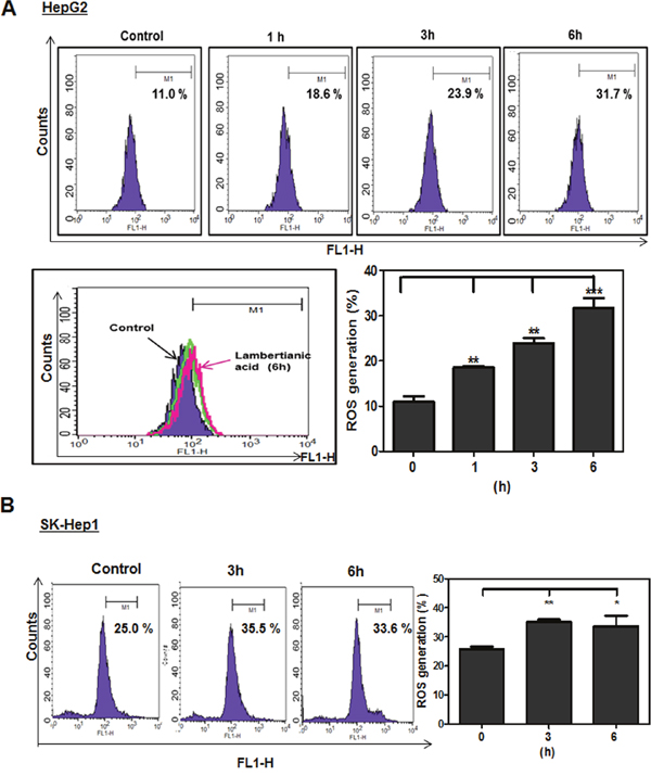 Figure 4: Effect of LA on ROS production in HepG2 and SK-Hep1 cells. HepG2 (A) and SK-Hep1 (B) cells were treated with LA (40 μM) for 1 h, 3 h, 6 h and then 5 μM DCFH-DA for 30 min at 37°C. Experiments were performed three times. Fluorescence intensity was measured by FACS Calibur. Bar graphs showed quantification of ROS generation (%). Data represent means ± SD. * p<0.05, **, p<0.01 and ***, p<0.001 versus untreated control (n=3, one-way ANOVA, Tukey's test).