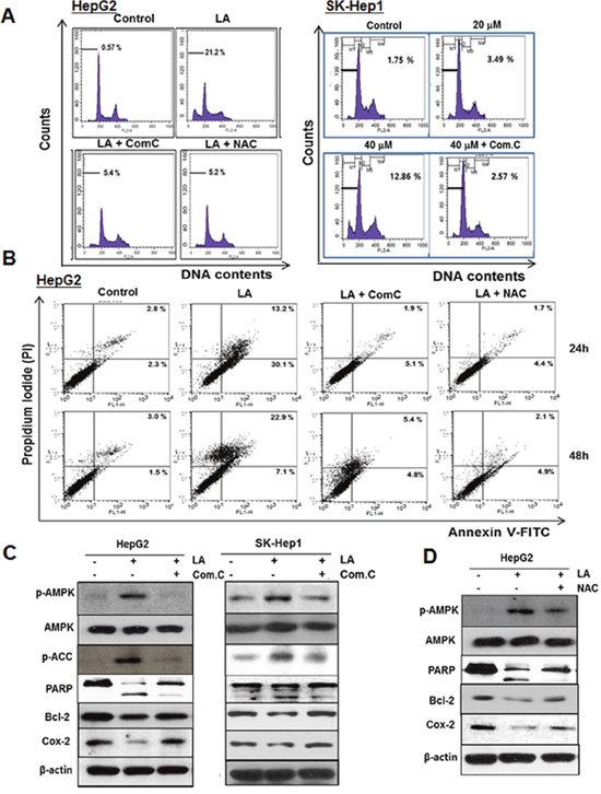 Figure 5: ROS and AMPK signalings mediate LA induced apoptosis in HCC cells. (A) HepG2 and SK-Hep1 cells were treated with LA (40 μM) in the absence and presence of compound C (7.5 μM) or NAC (5 mM). After fixing in 75% ethanol, the cells were stained with PI and the cell cycle was analyzed by flow cytometry. (B) HepG2 cells were treated with LA (40 μM) for 24 h and 48 h in the absence and presence of compound C (7.5 μM) or NAC (5 mM). The cells were stained using FITC-Annexin V/PI dye and early and late apoptotic portions were detected by flow cytometry. (C) HepG2 and SK-Hep1 cells were treated with various concentrations of LA (20, 40 μM) for 24 h with or without compound C. Then Western blotting was conducted in LA and/or compound C treated HCCs with antibodies of p-AMPK, AMPK, p-ACC, PARP, Bcl-2, COX-2 and β-actin. (D) HepG2 cells were exposed to LA (40 μM) in the presence or absence of NAC and subjected to Western blotting for p-AMPK, AMPK, PARP, Bcl-2, COX-2 and β-actin.