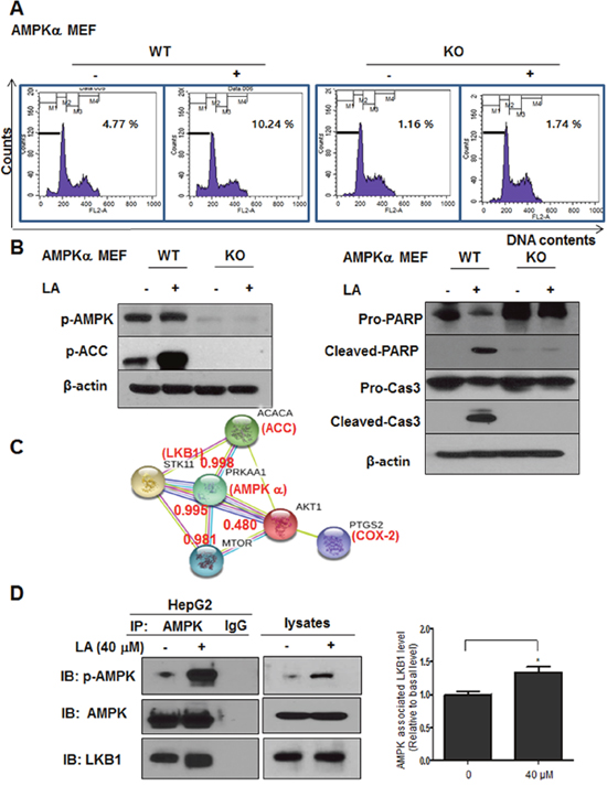 To further confirm the critical role of AMPK in LA induced apoptosis, AMPK α wild type and knockout (KO) mouse embryonic fibroblast (MEF) cells were used in this study. Herein LA increased sub-G1 population to 10.24% in AMPK α wild type MEF cells compard to untreated control (4.77%), while there were no significant changes of subG1 population in AMPK KO MEF cells (Figure 6A). Consitently, Western blotting showed that cleavages of PARP and caspase-3 and phosphorylation of AMPK and ACC were induced in AMPK α wild type MEF cells by LA, but not in AMPK KO MEF cells (Figure 6B). Of note, STRING database showed that Protein-Protein Interaction(PPI) scores between AMPK and other proteins such as ACC, LKB1, mTOR and AKT1 were found 0.998, 0.995, 0.981 and 0.480, respectively (Figure 6C). Next, immunoprecipitation (IP) was performed with lysates from HepG2 cells using anti-AMPK antibody and Western-blot analysis was also conducted to confirm the binding of AMPK and LKB1. Here IP revealed that AMPK was directly bound to LKB1 in LA treated HepG2 cells (Figure 6D).