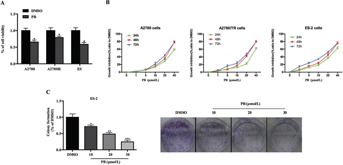 Figure 1: Effects of Physapubescin B on OC cell growth. (A) Cell viabilities of A2780, A2780R and ES-2 cells were determined by CCK8 assays, 24 h after 20 μmol/L Physapubescin B were added into the cultures. (B) Dose effects of Physapubescin B on cell proliferation. Different dosages of Physapubescin B were added into cell cultures as in (A), and cell viabilities were assessed at each time points as indicated. (C) Effects of Physapubescin B on colony formation abilities of ES-2 cells. Different concentrations of Physapubescin B were added into soft agar medium before ES-2 cells were seeded in. The number of colonies were calculated 72 h after cells had been seeded (left). The representative pictures were exhibited (right, 40×). Data are presented as mean±SD. *P<0.05, **P<0.01, ***P<0.001. All experiments were repeated at least three times independently.