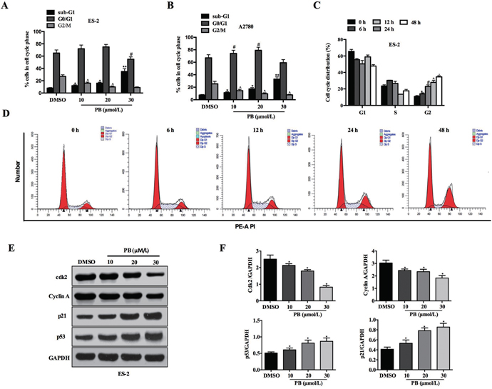 Figure 2: Effects of Physapubescin B on cell-cycle progression. (A and B) Cell cycles were checked by PI staining, 24 h after Physapubescin B with different concentrations as indicated were added into ES-2 and A2780 cell cultures. (C and D) ES-2 cells were treated with 20 μmol/L Physapubescin B as in A, and cells cycles were analyzed by PI staining at each time points as indicated. (C) Statics results and (D) representative pictures. (E) ES-2 cells were treated as in A, cells were harvested for protein gel analysis. (F) Statics results of (E). Data are presented as mean±SD. *P<0.05, **P<0.01. All experiments were repeated at least three times independently.