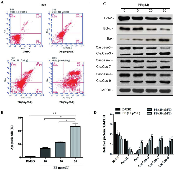 Figure 3: Physapubescin B induced apoptosis of OC cells. (A and B) Apoptosis of ES-2 cells treated by different concentrations of Physapubescin B as indicated for 24h were analyzed by FACS. (A) Representative pictures and (B) stastics results. (C) ES-2 cells were treated as in A, cells were harvested for protein gel analysis. (D) The densitometric analyses results of (C). Data are presented as mean±SD. *P<0.05, **P<0.01. All experiments were repeated at least three times independently.