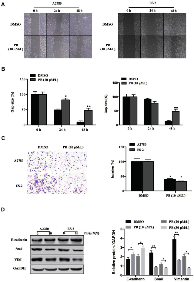Figure 4: Physapubescin B inhibited migration of OC cells. (A) Would healing assay of A2780 and ES-2 cells treated with 10 μmol/L Physapubescin B. Pictures were captured at indicated time points. (B) Statics results of (A). (C) Transwell assay of A2780 and ES-2 cells treated as in (A). Pictures were captured 48 h after seeding (left). Statics results (right panel). (D) A2780 and ES-2 cells were treated as in (A). Cells were harvested 48 h later, and then subjected to western blot analysis. Right panels represent the results of densitometric analyses. Data are presented as mean±SD. *P<0.05, **P<0.01. All experiments were repeated at least three times independently.