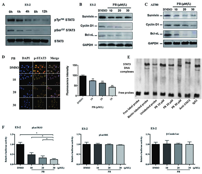 Figure 5: Physapubescin B inhibited STAT3 signaling in OC cells. (A) ES-2 cells were treated with 20 μmol/L Physapubescin B. Cells were harvested at each time points as indicated and then analyzed by western blot. (B and C) ES-2 (B) and A2780 (C) cells were treated with Physapubescin B of different concentrations as indicated. Cells were harvested 24 h later and then subjected to western blot analysis. GAPDH served as a loading control. (D) ES-2 cells were treated with an increase amount of Physapubescin B as indicated for 24 h. Then, cells were fixed and subjected to immunofluorescence (IF) analysis. The right panels represent the results of densitometric analyses. (E) In vitro EMSA assays. Purified STAT3 protein were incubated with oligonucleotides containing the conserved STAT3 binding sites and an increase amount of Physapubescin B as indicated. (F) Luciferase reporter activities in cytosolic extracts prepared from ES-2 cells transiently cotransfected with the Stat3-dependent (pLucTKS3), or the Stat3-independent (pLucSRE or β-casein promoter-driven Luc) luciferase reporters together with a plasmid expressing the v-Srconcoprotein, and untreated (0.05% DMSO) or treated with different concentrations of Physapubescin B as indicated for 24 h. Data are presented as mean±SD. *P<0.05, **P<0.01. All experiments were repeated at least three times independently.