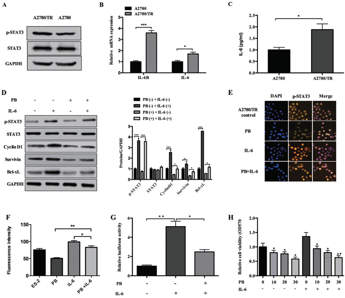 Figure 6: Effects of Physapubescin B on taxol-resistance A2780 cells. (A) Whole cell lysates of A2780 and A2780/TR cells were subjected to western bolt analysis. (B) Total RNA were extracted from A2780 and A2780/TR cell cultures and then the mRNA level of IL-6 and IL-6R were determined by qPCR. Data were normalized to GAPDH. (C) Supernatants collected from A2780 and A2780/TR cell cultures were subjected to ELISA analysis. (D) A2780/TR cells were left untreated (0.05% DMSO), or treated with IL-6 (10 ng/mL), Physapubescin B (10 μmol/L), or both for 24 h. Cells were then harvested for western blot analysis. The right panels represent the results of densitometric analyses. (E) A2780/TR cells were treated as in (D). Cells were then fixed and subjected to IF analysis. (F) The results of densitometric analyses of (E). (G) A2780/TR cells were transfected with the pLucTKS3 luciferase reporters. 24 h later, these cells were left untreated, or treated with IL-6 (10 ng/mL), or IL-6 (10 ng/mL) and Physapubescin B (10 μmol/L). Luciferase activities in the cytosolic extracts prepared from these cells 48 h after transfection were determined by a reporter system. (H) A2780/TR cells were treated with different concentrations of Physapubescin B as indicated, either with IL-6 (10 ng/mL) or not. 48 h later, cell viabilities were determined by MTT assays. Data are presented as mean±SD. *P<0.05, **P<0.01. All experiments were repeated at least three times independently.