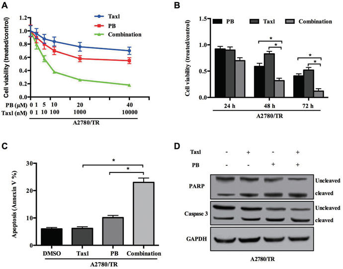 Figure 7: Physapubescin B resensitize taxol resistant OC cells to taxol treatment. (A) A2780/TR cells were treated with Physapubescin B, or taxol, or both of them in different concentrations as indicated. Cell viabilities were determined 48 h later. (B) A2780/TR cells were treated with Physapubescin B (5 μmol/L), or taxol (10 nmol/L), or both of them. Cell viabilities were determined at each time points as indicated. (C and D) A2780/TR cells were left untreated (0.05% DMSO), or treated with Physapubescin B (5 μmol/L), or taxol (10 nmol/L, or both of them for 24 h. Cells were then collected for FASC analysis (C) and western blot analysis (D). Data are presented as mean±SD. *P<0.05. All experiments were repeated at least three times independently.