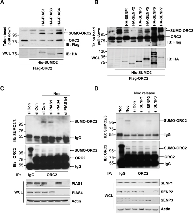 Figure 1: Cell-cycle regulated ORC2 SUMOylation by PIAS4 and SENP2. (A) U2OS cells were transfected with indicated plasmids. Talon beads pull-down was performed and precipitates were blotted with anti-FLAG antibody. Whole cell lysates (WCL) were blotted with HA antibody. (B) U2OS cells were transfected with indicated plasmids. Talon beads pull-down was performed and precipitates were blotted with anti-FLAG antibody. Whole cell lysates (WCL) were blotted with HA antibody. (C) U2OS cells were transfected with the indicated siRNA or control siRNA and treated with nocodazole for 24 hours. Cells were fractionated and the chromatin fraction was subjected to immunoprecipitation with ORC2 antibody. Immunoprecipitates were blotted with ORC2 or SUMO2 antibody. (D) U2OS cells were transfected with the indicated siRNA or control siRNA and treated with nocodazole for 24 hours, and then were released into fresh media for 2 hours. Cells were fractionated and the chromatin fraction was subjected to immunoprecipitation with ORC2 antibody. Immunoprecipitates were blotted with ORC2 or SUMO2 antibody. In all the figures, asterisks are indicated as non-specific bands. Arrows are indicated as SUMOylated ORC2, non-SUMOylated ORC2, or IgG.
