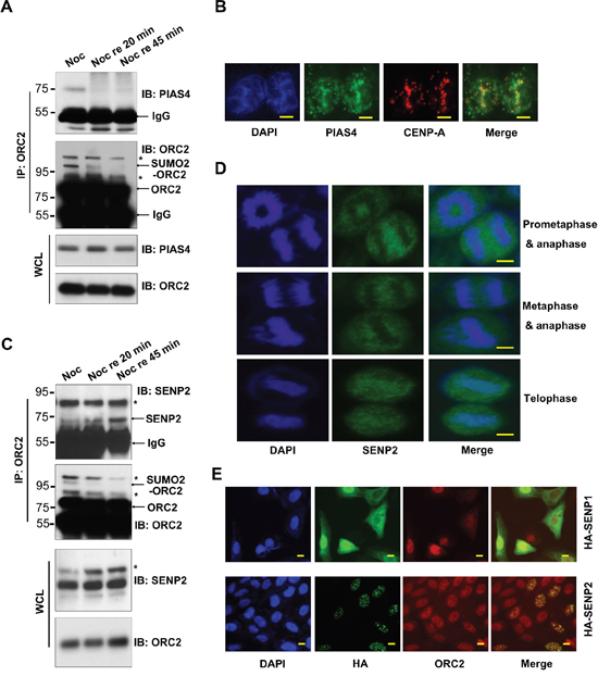 Figure 2: Dynamic interaction between ORC2 and PIAS4 or SENP2. (A) U2OS cells were treated with nocodazole for 24 hours and then released into fresh medium for indicated times. Immunoprecipitation was performed with ORC2 antibody and immunoprecipitates were blotted with ORC2 or PIAS4 antibody. Asterisks are indicated as non-specific bands and arrows are indicated as SUMOylated ORC2, non-SUMOylated ORC2, or IgG. (B) U2OS cells were treated with RO3306 and immunostaining was performed with PIAS4 antibody (green) and CENP-A antibody (red). Nuclei were stained with DAPI (blue). Scale bar: 10uM. (C) U2OS cells were treated with nocodazole for 24 hours and then released into fresh medium for indicated times as in (A). Immunoprecipitation was performed with ORC2 antibody and immunoprecipitates were blotted with ORC2 or SENP2 antibody. Asterisks are indicated as non-specific bands and arrows are indicated as SUMOylated ORC2, non-SUMOylated ORC2, or IgG. (D) U2OS cells were immunostained with SENP2 antibody. SENP2 staining (green) at different stages of mitosis was observed by microscope. Nuclei were stained with DAPI (blue). Scale bar: 10uM. (E) U2OS cells were transiently transfected with indicated plasmids. Cells were immunostained with HA antibody (green) and ORC2 antibody (red). Nuclei were stained with DAPI (blue). Scale bar: 10uM.