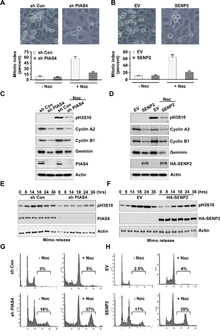 Figure 4: Deregulated expression of PIAS4 or SENP2 results in by pass of mitosis. (A and B) U2OS cells stably expressing PIAS4 shRNA (A) or SENP2 (B) were treated with or without nocodazole for 20 hours. Cell image (upper panels) and Mitotic index (lower panels) was shown. (C and D) U2OS cells stably expressing PIAS4 shRNA (C) or SENP2 (D) were treated with or without nocodazole for 20 hours. Western blot was performed to detect expressions of different proteins as indicated. (E and F) U2OS cells stably expressing PIAS4 shRNA (E) or SENP2 (F) were treated with mimosine for 24 hours. Cells were released into fresh medium for different times. Western blot was performed to detect expression of phosphorylated histone H3 Ser 10. (G and H) U2OS cells stably expressing PIAS4 shRNA (G) or SENP2 (H) were treated with or without nocodazole for 24 hours. Cell cycle profiles were analyzed by FACS.