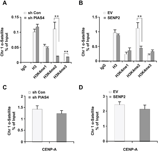 Figure 5: Depletion of PIAS4 or overexpression of SENP2 leads to abnormal histone H3K4 methylation. (A and B) The relative occupancy of H3, H3K4me1, H3K4me2, and H3K4me3 within α-satellite of chromosome 1 was analyzed using ChIP-PCR in cells stably expressing PIAS4 shRNA (A) or SENP2 (B). The graph shows the average of three independent experiments; mean ± S.D. **, p < 0.01. (C and D) The relative occupancy of CENP-A within α-satellite of chromosome 1 was analyzed using ChIP-PCR in cells stably expressing PIAS4 shRNA (C) or SENP2 (D). The data represent the means and SEM of three independent experiments.