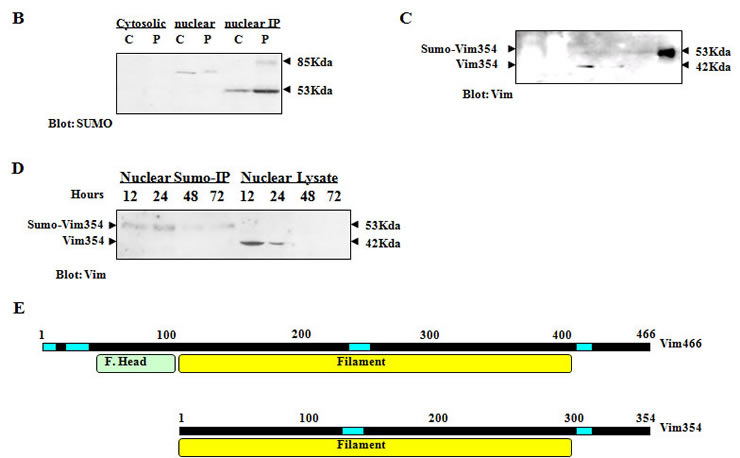 Figure 2 B & C. Quiescent cells were infected with Ad/PIAS3 for 24 hrs and cytosolic or nuclear protein lysate was prepared. Then 80% of the nuclear protein immunoprecipitated by SUMO antibody (nuclear IP) from Ad/EGFP mock control (C) or Ad/PIAS3 (P) infected U373 cells were immunoblotted to demonstrate the same motility of both SUMO (B) and vimentin354 (C). Fifty microgram each of cytosolic and nuclear proteins was blotted to display the molecular weight of unmodified vimentin354 at about 41.5 kDa. D. Sumoylation of nuclear vimentin354 at different time points after Ad/PIAS3 infection. E. Comparison of vimentin354 and vimentin466. With 91% of homology, each has a filament rod domain, essential for protein-protein interaction. vimentin354 lacks an IF head domain, which is responsible for DNA binding, at the N-terminus.