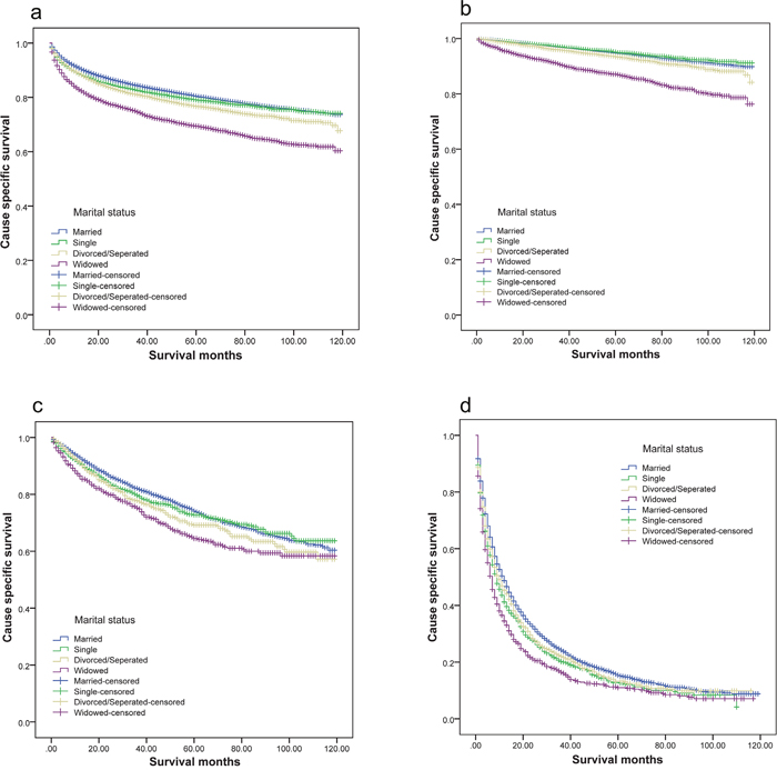 Despite these limitations, our study demonstrated a direct association between cancer patient marital status and prognosis based on a large and representative population. In summary, married patients had better survival rates than unmarried patients. We speculated that psychosocial and socioeconomic statuses might contribute to the better outcomes of married patients. This study highlights the importance of psychological intervention for cancer patients during treatment, especially for those who are unmarried.