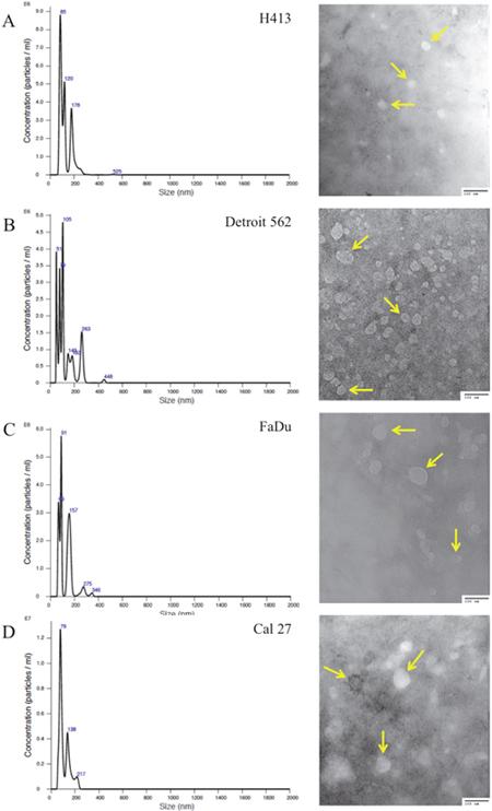 Figure 1: Size distribution plots from nanoparticle tracking analysis of exosome isolates from culture media of head and neck squamous cell carcinoma (HNSCC) cell lines. (A) H413, (B) Detroit 562, (C) FaDu, and (D) Cal 27, according to particle diameter. Representative transmission electron microscopy (TEM; 200,000x) images of exosomes isolated from each respective HNSCC line are presented to the right of each plot; arrows highlight representative exosomes. A 100-nm scale bar is provided in the bottom right hand corner of each image for perspective.