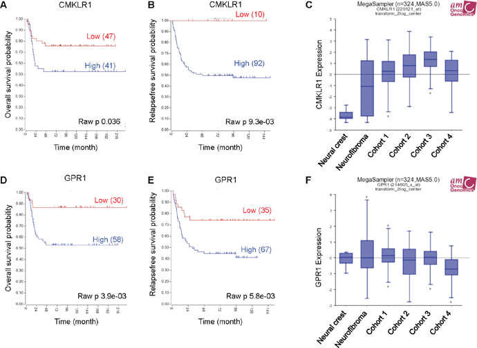 Figure 1: High CMKLR1 and GPR1 expression predicts poor survival in neuroblastoma patients. Expression data was analyzed using the R2 database http://r2.amc.nl. Kaplan-Meier survival estimates were used to evaluate the prognostic value of CMKLR1 (A, B) and GPR1 (D, E) expression in two patient data sets (A and D: Versteeg n=88; B and E: Seeger n=102). The Kaplan-Meier scanning tool was used to determine the CMKLR1 and GPR1 mRNA expression in neuroblastoma. All expression data were scanned to find the most optimal cut-off between high and low gene expression and the log-rank test that gave the lowest p-value was calculated to search for significant differences between tumor samples expressing high and low CMKLR1 and GPR1 mRNA levels, respectively. The expression of CMKLR1 (C) and GPR1 (F) was compared between neural crest (Etchevers n=5), benign neurofibroma (Miller n=86) and 4 neuroblastoma cohorts (cohort 1: Versteeg n=88, cohort 2: Delattre n=64, cohort 3: Hiyama n=51, cohort 4: Lastowska n=30).