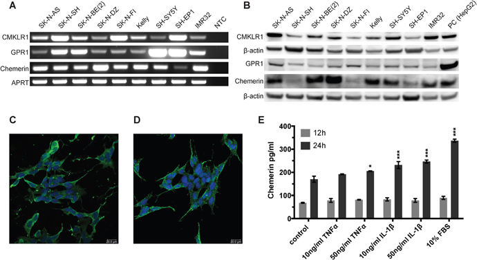 Figure 2: CMKLR1, GPR1 and chemerin are expressed in neuroblastoma cell lines and TNFα, IL-1β, and serum stimulate chemerin secretion. (A) RT-PCR analysis demonstrating the expression of chemerin, CMKLR1 and GPR1 mRNA in all neuroblastoma cell lines investigated. NTC, no template control. The expression of chemerin, CMKLR1, and GPR1 protein was confirmed by western blot (B). HepG2 cells were used as a positive control. The images are representative of three independent experiments. Immunofluorescence labeling shows the presence of CMKLR1 (C) and GPR1 (D) in SH-SY5Y cells (green). The nuclei (blue) were stained with Hoechst 33342, scale bar 20μm. (E) Chemerin concentrations were measured in cell supernatants of SK-N-AS cells after treatment with 10 or 50ng/ml TNFα, IL-1β or 10% FBS for 12 or 24h, respectively. The supernatants of 10 independent samples were pooled and concentrated 10x prior to ELISA measurement. The standards and samples were measured in duplicates and the data is presented as mean and range. Statistical analysis was performed using a two-way ANOVA P<0.001 for both stimulation and incubation time followed by Dunnett’s post-test control vs. treatment * P<0.05, *** P<0.001.