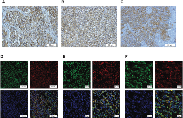 Figure 3: CMKLR1, GPR1 and chemerin are expressed in neuroblastoma primary tumors. Immunoperoxidase staining demonstrates specific expression of (A) CMKLR1, (B) GPR1 and (C) chemerin in neuroblastoma primary tumor tissue. Immunofluorescence labeling (D-F) displays CMKLR1 (green) and chemerin (red) localization in neuroblastoma tissue. The nuclei were stained with DAPI (blue). (E and F) are higher magnifications of (D) to illustrate the colocalization of CMKLR1 and chemerin. The displayed images are representative stainings from a panel of neuroblastoma tumors.